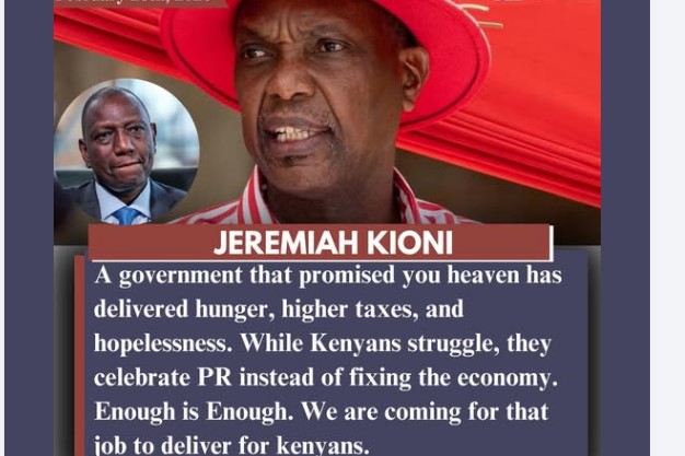 In a strongly worded statement, Kioni claimed the government pledged prosperity but has instead presided over rising taxes, economic hardship and growing frustration among citizens. “A government that promised you heaven has delivered hunger, higher taxes, and hopelessness,” he said, adding that leaders appear more focused on public relations than addressing economic challenges.