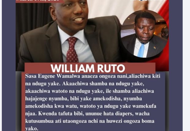 Ruto humiliates Eugene Wamalwa-Sasa Eugene Wamalwa anaeza ongoza nani,aliachiwa kiti na ndugu yake. Akaachiwa shamba na ndugu yake, akaachiwa watoto na ndugu yake, ile shamba aliachiwa hajajenge nyumba, bibi yake amekodisha, nyumba amekodisha kwa watu, watoto ya ndugu yake wamekufa njaa