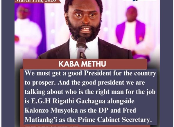 “We must get a good President for the country to prosper. And the good president we are talking about who is the right man for the job is E.G.H Rigathi Gachagua alongside Kalonzo Musyoka as the DP and Fred Matianhg’i as the Prime Cabinet Secretary.” Kaba Methu
