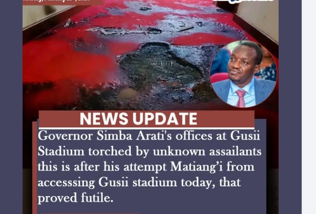 Breaking; Governor Simba Arati’s offices at Gusii Stadium torched by unknown assailants this is after his attempt to block Matiang’i from accesssing Gusii stadium today, that proved futile.