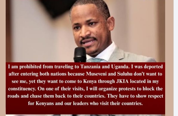 “I am prohibited from traveling to Tanzania and Uganda. I was deported after entering both nations because Museveni and Suluhu don’t want to see me, yet they want to come to Kenya through JKIA located in my constituency. On one of their visits, I will organize protests to block the roads and chase them back to their countries. They have to show respect for Kenyans and our leaders who visit their countries,” said Babu Owino.