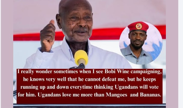 Museveni dismisses Bobi Wine-“I really wonder sometimes when I see Bobi Wine campaigning, he knows very well that he cannot defeat me, . Ugandans love me more than Mangoes and Bananas.”