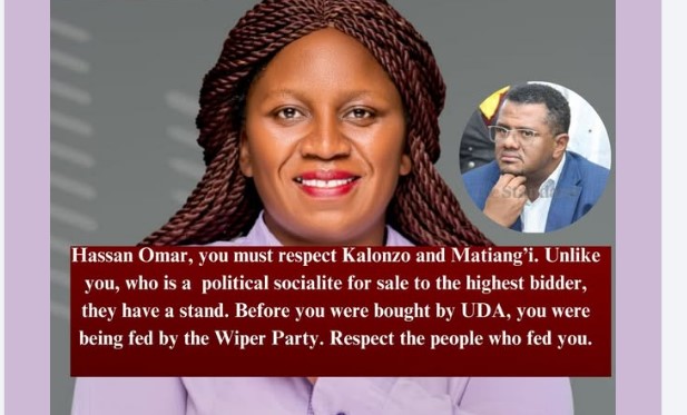 Joyce Wangui of Wiper Party hits back at Hassan Omar after he attacked Kalonzo and Matiang’i-“Hassan Omar, you must respect Kalonzo and Matiang’i. Unlike you, who is a political socialite for sale to the highest bidder,”