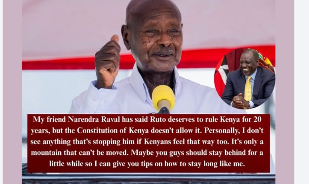 Museveni tells Ruto in Uganda-My friend Narendra Raval has said Ruto deserves to rule Kenya for 20 years, but the Constitution of Kenya doesn’t allow it. Personally, I don’t see anything that’s stopping him if Kenyans feel that way too.