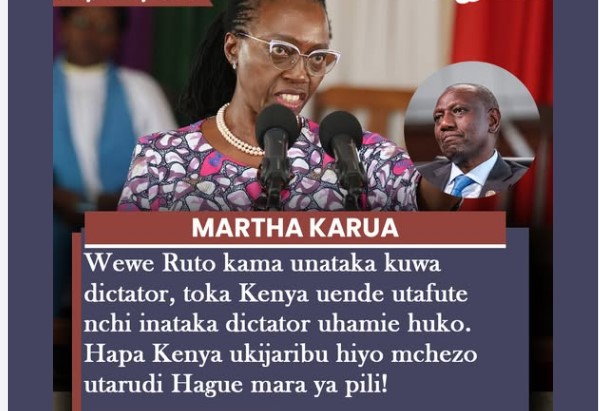 Martha Karua sends a flaming warning to Ruto-Wewe Ruto kama unataka kuwa dictator, toka Kenya uende utafute nchi inataka dictator uhamie huko. Hapa Kenya ukijaribu hiyo mchezo utarudi Hague mara ya pili!