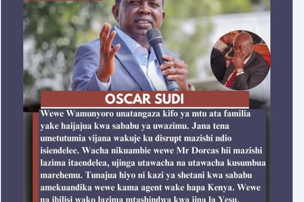 Kauli kali ya Mbunge wa Kapseret, Oscar Sudi, imezua mjadala mkali katika siasa za Kenya baada ya kumshambulia vikali anayeitwa “Wamunyoro” katika ujumbe uliojaa hasira na lawama nzito. Katika kauli hiyo, Sudi anamlaumu mtu huyo kwa kutangaza kifo cha mtu kabla familia yake haijapewa taarifa rasmi. Anadai kuwa kitendo hicho ni cha “uwazimu” na kukosa […]