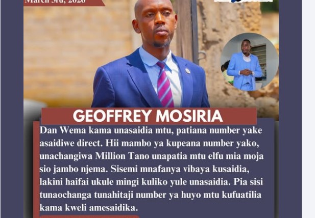 Geoffrey Mosiria lectures Dan Wema-Dan Wema kama unasaidia mtu, patiana number yake asaidiwe direct. Hii mambo ya kupeana number yako, unachangiwa Million Tano unapatia mtu elfu mia moja sio jambo njema