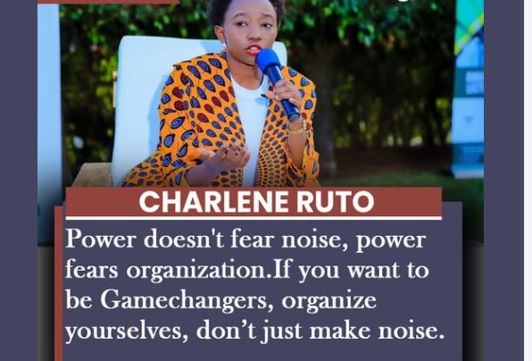 Charlene Ruto advices Kenyans on how they can defeat Ruto-Power doesn’t fear noise, power fears organization.If you want to be Gamechangers, organize yourselves, don’t just make noise.