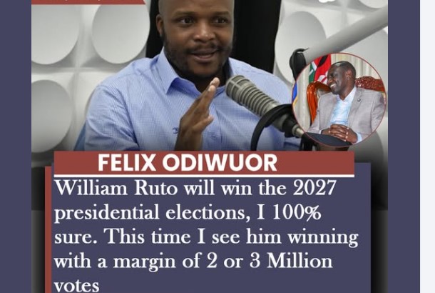 Jalang’o-William Ruto will win the 2027 presidential elections, I 100% sure. This time I see him winning with a margin of 2 or 3 Million votes