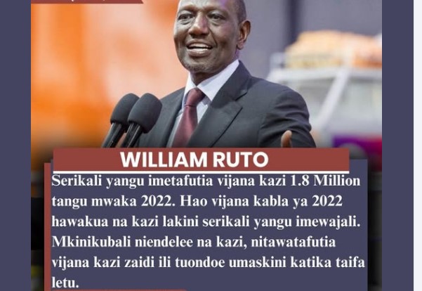 Serikali yangu imetafutia vijana kazi 1.8 Million tangu mwaka 2022. Hao vijana kabla ya 2022 hawakua na kazi lakini serikali yangu imewajali. ~William Ruto