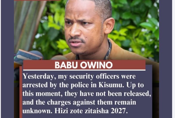 Babu Owino-Yesterday, my security officers were arrested by the police in Kisumu. Up to this moment, they have not been released, and the charges against them remain unknown. Hizi zote zitaisha 2027.