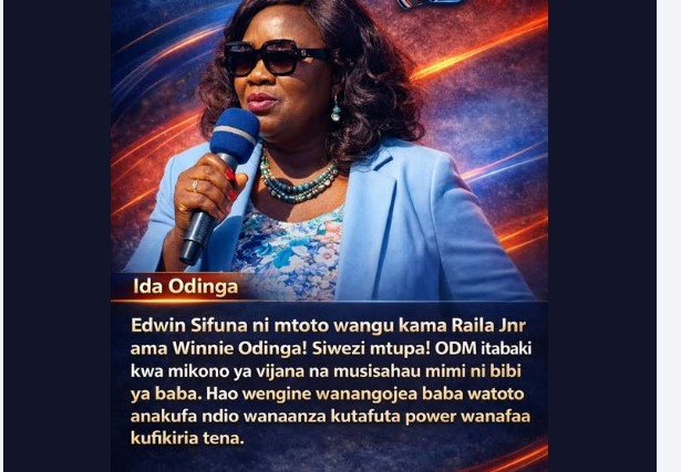 Edwin Sifuna ni mtoto wangu kama Raila Jnr ama Winnie Odinga! Siwezi mtupa! ODM itabaki kwa mikono ya vijana na musisahau mimi ni bibi ya baba. Hao wengine wanangojea baba watoto anakufa ndio wanaanza kutafuta power wanafaa kufikiria tena.