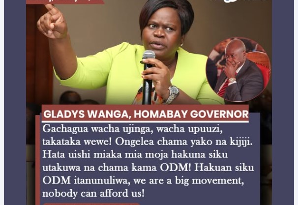 Homa Bay Governor Gladys Wanga has sharply responded to former Deputy President Rigathi Gachagua in a fiery defense of the Orange Democratic Movement (ODM). Speaking during a public event, Wanga did not hold back, telling Gachagua to stop what she termed as “nonsense” and focus on building his own party instead of attacking ODM. She […]