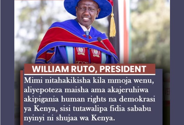 President Ruto tells Luos in Kisumu-Mimi nitahakikisha kila mmoja wenu, aliyepoteza maisha ama akajeruhiwa akipigania human rights na demokrasi ya Kenya, sisi tutawalipa fidia