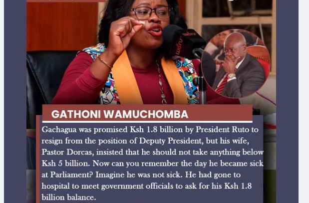 Wamuchomba exposes Gachagua badly-Gachagua was promised Ksh 1.8 billion by President Ruto to resign from the position of Deputy President, but his wife, Pastor Dorcas, demanded Ksh 5 billion.