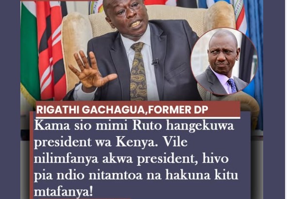 Deputy President Rigathi Gachagua has made strong remarks about his role in President William Ruto’s rise to power, claiming he was instrumental in securing Ruto’s presidency. Speaking during a public gathering, Gachagua said, “Kama sio mimi Ruto hangekuwa president wa Kenya. Vile nilimfanya akakuwa president, hivo pia ndio nitamtoa na hakuna kitu mtafanya!” His remarks […]