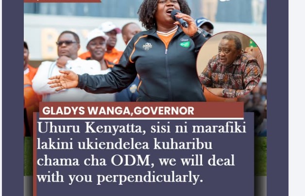 Gladys Wanga warns Uhuru Kenyatta-Wewe Uhuru Kenyatta, sisi ni marafiki lakini ukiendelea kuharibu chama cha ODM, we will deal with you perpendicularly.