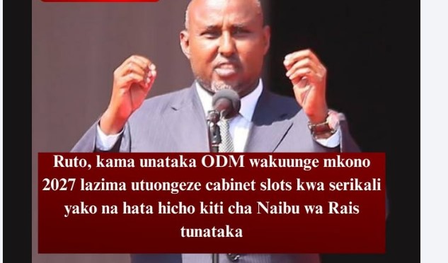 ”Ruto, kama unataka ODM wakuunge mkono 2027 lazima utuongeze cabinet slots kwa serikali yako na hata hicho kiti cha Naibu wa Rais tunataka,” Junet Mohammed