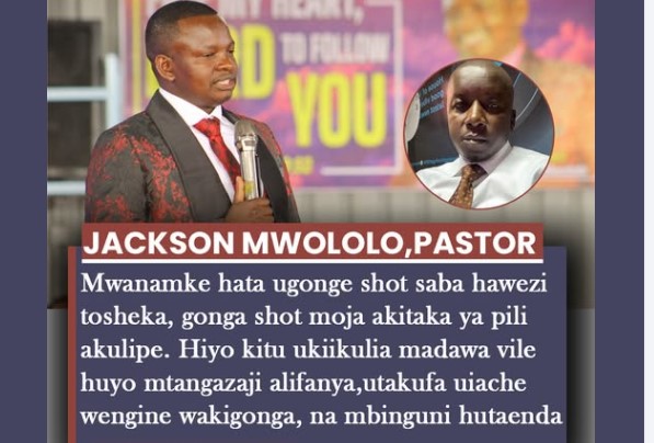 Pastor Jackson Mwololo says while reacting to Festus Amimo’s death-“Mwanamke hata ugonge shot saba hawezi tosheka, gonga shot moja akitaka ya pili akulipe”