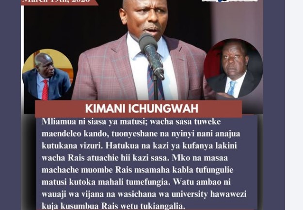 Maendeleo kando!!~Mliamua ni siasa ya matusi; wacha sasa tuweke maendeleo kando, tuonyeshane na nyinyi nani anajua kutukana vizuri~ Kimani Ichungwah declares