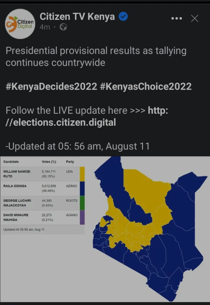 According to the 6:00am Citizen TV updates on the provisional presidential candidates results, the UDA boss William Ruto was leading with 5,184,711 votes equivalent to 50.15% of the votes. The Azimio leader Raila Odinga came second with 5,012,859 accounting for 48.48% of the votes. The media house had at the time managed to give results for over 10 million votes cast.