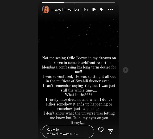 “I was utterly bewildered as he eloquently poured out his feelings in the most fluent Swahili imaginable…I can’t recall saying ‘yes,’ but throughout the dream, I was in a state of utter disbelief. I rarely have dreams, and when I do, they somehow manifest in reality. I’m not sure what the universe was trying to convey, but Otile, my eyes are fixed on you, my dear!” he concluded his brief musings.