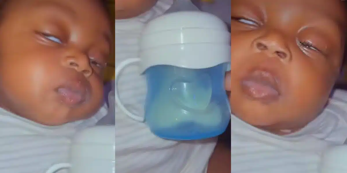 A little baby caught the attention of many on social media due to the awkward expression she made after drinking too much milk from a feeding bottle.