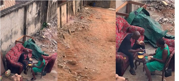 A couple who lost their home when it was torn down have been captured on camera enjoying their lives despite their predicament. The couple, who have been homeless for three months, were seen having breakfast under the hot sun. The video was captured by Efezino Ukpowe, who posted it on Twitter to raise awareness and hopefully get help for the couple before the rainy season begins.