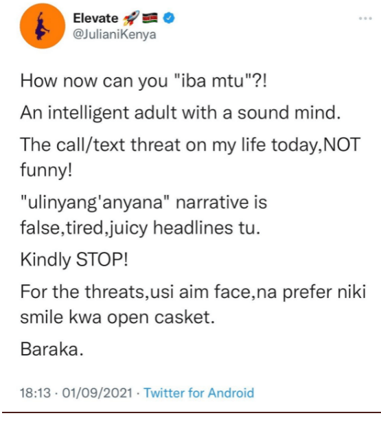 “My very good friend JulianiKenya was threatened yesterday. Someone called him and texted using 0773912088. He told him to stop posting pics posed with his friend LillyanneNganga and if he continues, they will kill him. He has recorded a statement at Kileleshwa Police Station,’’ Boniface Mwangi posted.