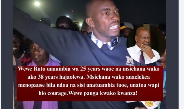 “Wewe Ruto unaambia wa 25 years waoe na msichana wako ako 38 years hajaolewa. Msichana wako anaelekea menopause bila ndoa na sisi unatuambia tuoe, unatoa wapi hio courage. Wewe panga kwako kwanza!”