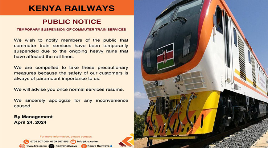 Kenya Railways Corporation (KRC) has announced the suspension of commuter train services until further notice, citing the persistent heavy rains that have affected railway lines. In a public advisory issued by KRC, the organization emphasized the impact of the deluge on the operational safety of the railway network.