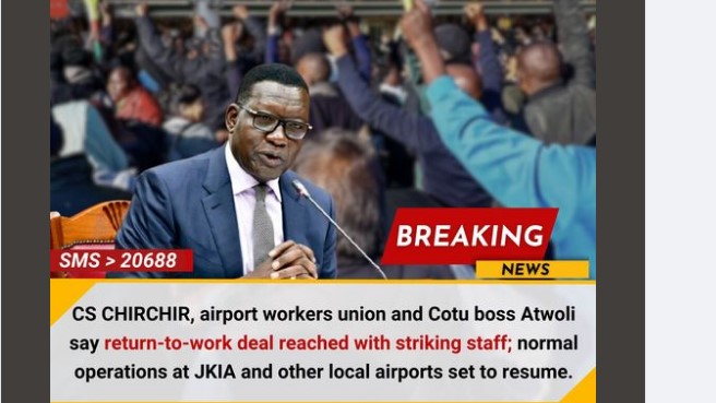 Kenya’s airport workers are set to resume their duties following an agreement reached with the government, Transport Cabinet Secretary Davis Chirchir, union leader Moss Ndiema, and Cotu chairman Francis Atwoli have announced.