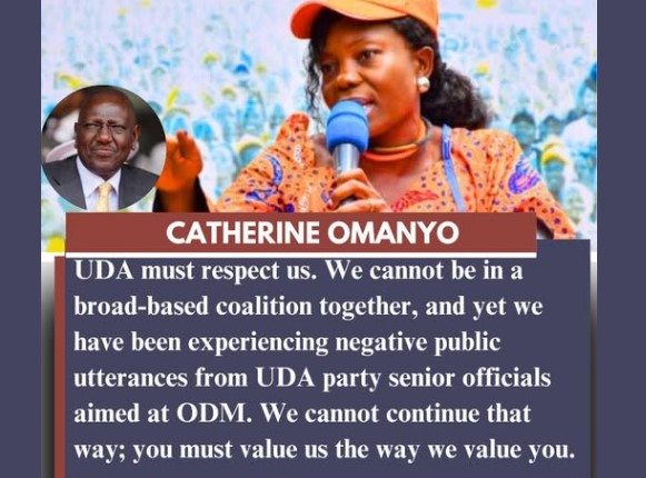 Her remarks signal growing friction within the working relationship between UDA and the Orange Democratic Movement (ODM), especially at a time when cooperation between the two sides has already shown signs of strain. By taking a firm stance, Omanyo appears to be defending ODM’s political space and pushing back against what the party may perceive as disrespect or sidelining by UDA members.