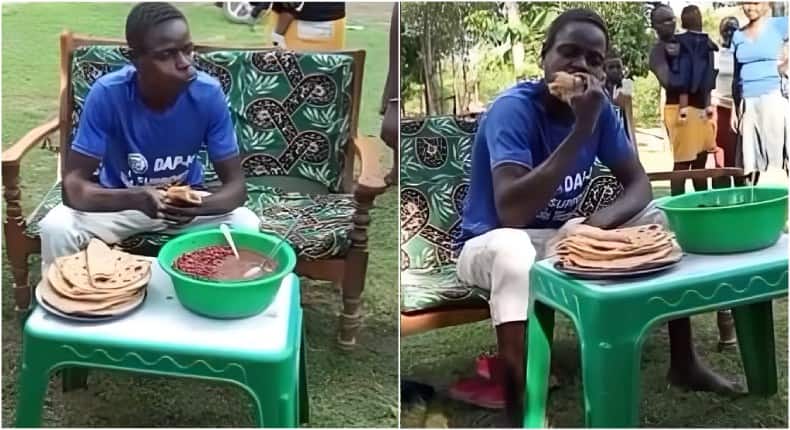 The meal that was prepared for Omondi consisted of 22 chapatis and a bowl of beans. This might seem like an excessive amount of food, but Omondi was determined to finish it all. He started with the beans, which he ate quickly and with gusto. Then he moved on to the chapatis, tearing off pieces with his hands and dipping them into the beans.