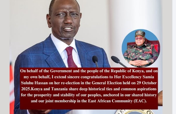 President William Ruto has sent a congratulatory message to Tanzania’s President Samia Suluhu Hassan following her re-election, extending warm wishes on behalf of the Kenyan people. Ruto praised President Suluhu for her leadership, describing her as a strong and visionary woman who has continued to uphold stability and unity in Tanzania.