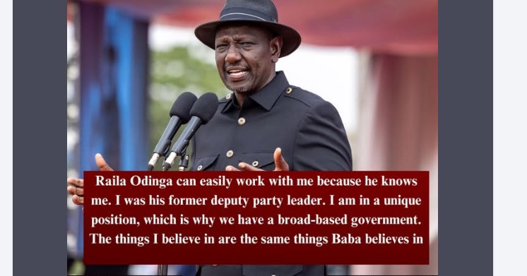 “Raila Odinga can easily work with me because he knows me. I was his former deputy party leader. I am in a very unique position, and that is why we have a broad-based government. The things I believe in are the same things Baba believes in,” Ruto stated.