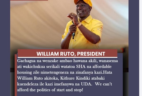 “Hata William Ruto akitoka, Kithure Kindiki atabaki kuendeleza ile kazi imefanywa na UDA. We can’t afford the politics of start and stop!” Ruto added, underscoring his concerns about political disruption to ongoing projects.