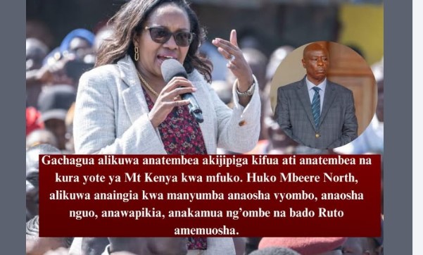 “Gachagua alikuwa anatembea akijipiga kifua ati anatembea na kura yote ya Mt Kenya kwa mfuko. Huko Mbeere North, alikuwa anaingia kwa manyumba anaosha vyombo, anaosha nguo, anawapikia, anakamua ng’ombe—na bado Ruto amemuosha.”