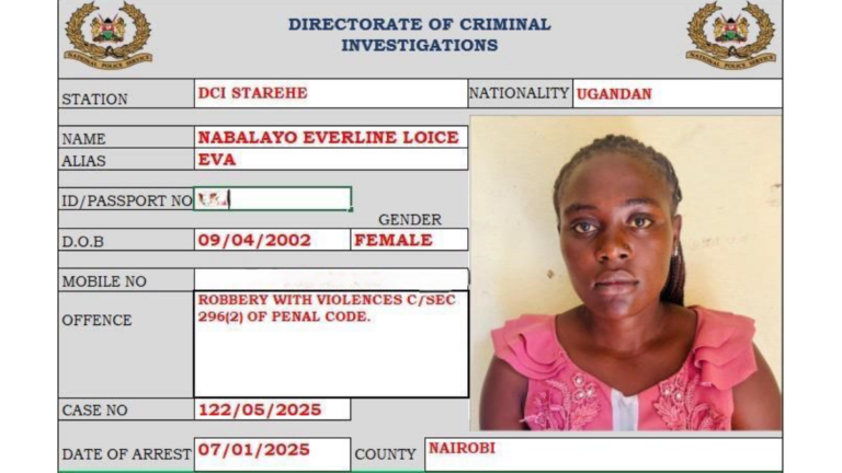 Nabalayo Everline Loice, 23, was arrested by detectives from the Directorate of Criminal Investigations (DCI) Starehe following the robbery incident on November 1, 2024.