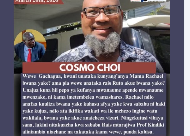 A heated political exchange has erupted following controversial remarks by Cosmo Choi directed at Rigathi Gachagua, in comments that have quickly drawn public attention and sparked debate across the country.