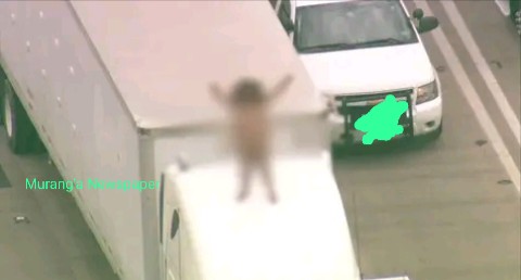 Drama was witnessed few hours ago in Kenol town- Murang’a County after a naked lady hopped ontop of a truck and caused havoc.